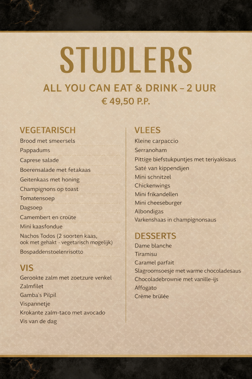 In restaurant Studlers verwelkomen wij gasten graag voor een kopje koffie, lunch, een borrel of diner. Op de regelmatig wisselende kaart zijn verfijnde gerechtjes te vinden. Er wordt zoveel mogelijk gewerkt met producten uit het seizoen en uit de omgeving.